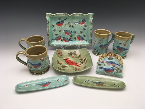 These pieces were created using stamps carved from clay. I chose birds that I think are beautiful or have a dynamic personality and combined them with berries and flowers. The flowers, leaves, and berries are three dimensional on some pieces by making them from small sprigs (a small molded decoration made from clay). Inspiration for the series comes from nature, Oriental prints, and designs created during the Arts and Crafts Movement. Much of the color of the birds and berries is applied by brush with vibrant underglazes. On top of all the decoration goes a tinted transparent glaze that I formulated.